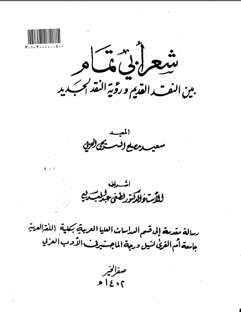 عنوان الكتاب: شعر أبي تمام بين النقد القديم و رؤية النقد الجديد